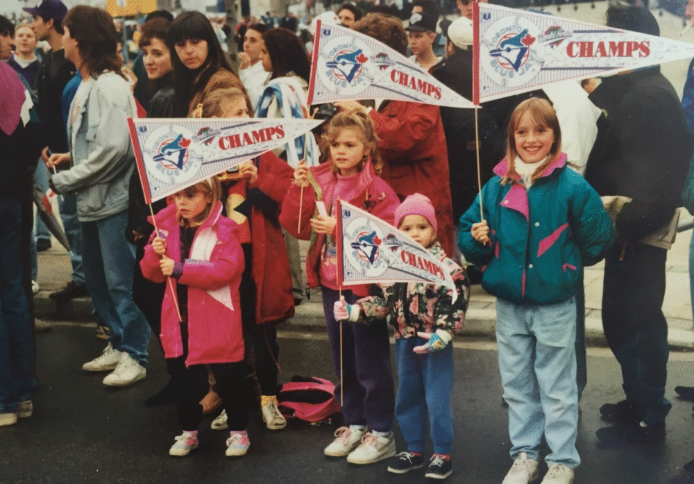 This photo is from 1993, when the Blue Jays last won. It was such an exciting time, Mum took us out of school to go to the parade in Toronto. It’s wild that Game three went into 18 innings. It started at 8 pm and went until 2 am! We started watching it on our way home from Milwaukee in the Chicago airport and finished the game at home in Toronto.